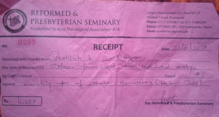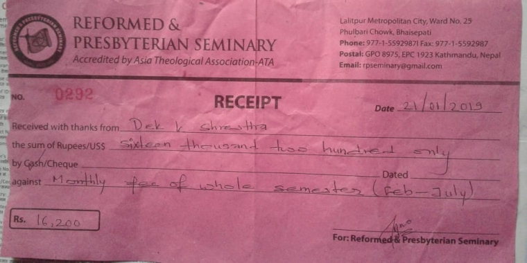 Respected Dr.Sab Warm Greeting to you. Thank for the scholarship budget and Thank you Elder Park EungGyu for supporting Dek Kumar Shrestha to study theology. They are the future pastors in Milan Church society. Milan Church will be having a train pastors in future. May God Bless you. Sir I have paid the RPS Collage fee this will be the second semester. Aashish kumar Dek kumar have received the three month pocket money. Expenditure here 1. RPS Collage two person Fee Rs 32400 2. Pocket money three month two person Rs 18000 ---------------------------------------------------------------------------------- Total amount Rs 50400 (Fifty thousand four hundred only) After three month Aashish and Dek kumar will be receive the pocket money and remain money will be keeping safe for them. In Christ Ps. Amar Thapa